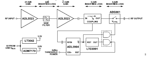 該電路中包含高速過(guò)載檢測(cè)器和關(guān)斷開(kāi)關(guān),用于保護(hù)連接至接收器系統(tǒng)的下游敏感設(shè)備。當(dāng)RF功率水平下降到可接受范圍內(nèi)時(shí),接收器系統(tǒng)也會(huì)自動(dòng)恢復(fù)正常運(yùn)行。RF輸入和輸出是標(biāo)準(zhǔn)的SMA連接器,整個(gè)設(shè)計(jì)由一個(gè)微型USB連接器供電。