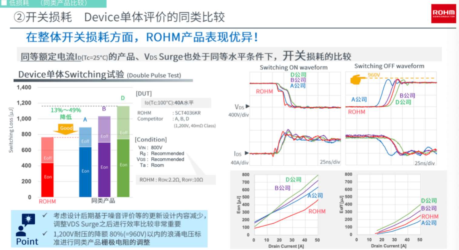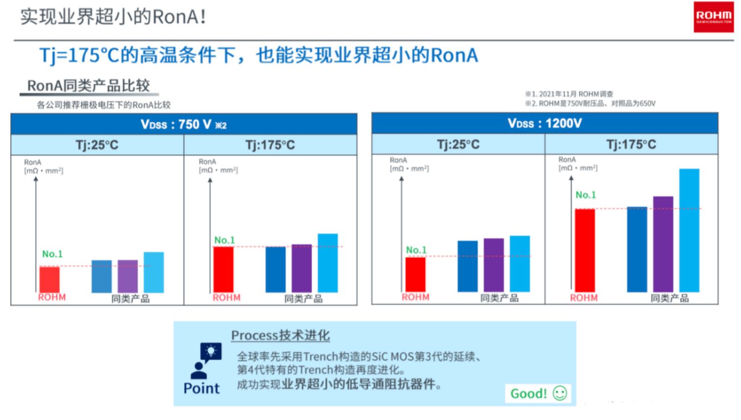 而且ROHM的第4代SiC MOSFET,在高溫下同樣也能實(shí)現(xiàn)業(yè)內(nèi)超小的RonA。對(duì)比同類產(chǎn)品,無(wú)論是常溫、室溫25度還是高溫175度,ROHM第4代SiC MOSFET都有著更出色的RonA表現(xiàn)。
