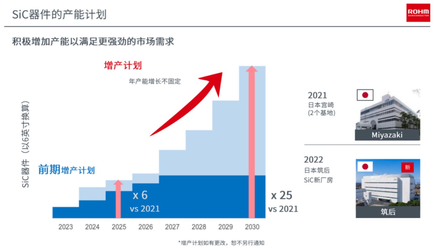 面對(duì)未來快速增長(zhǎng)的SiC市場(chǎng),ROHM也會(huì)繼續(xù)加大投資,預(yù)計(jì)未來,2021-2025五年內(nèi)會(huì)投入約1700-2200億日元。