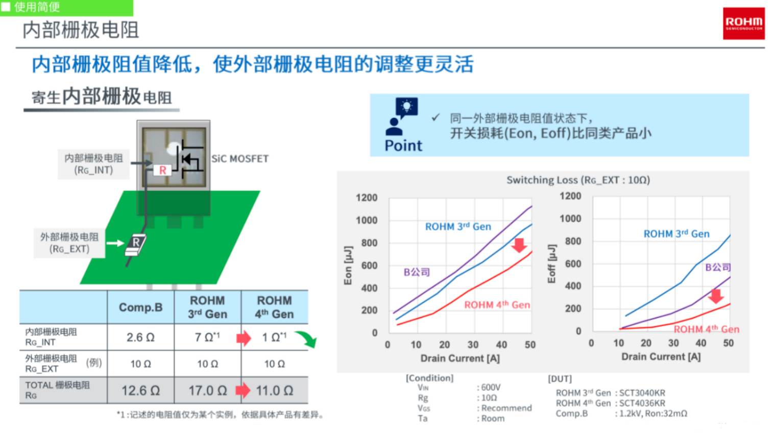 第三個(gè)使用的便利來自第4代SiC MOFET內(nèi)部柵極電阻的阻值進(jìn)一步降低。內(nèi)部柵極電阻降低,外部柵極電阻的調(diào)整就會(huì)更為靈活;而且同一柵極電阻阻值下,開關(guān)損耗也比同類產(chǎn)品會(huì)減少。