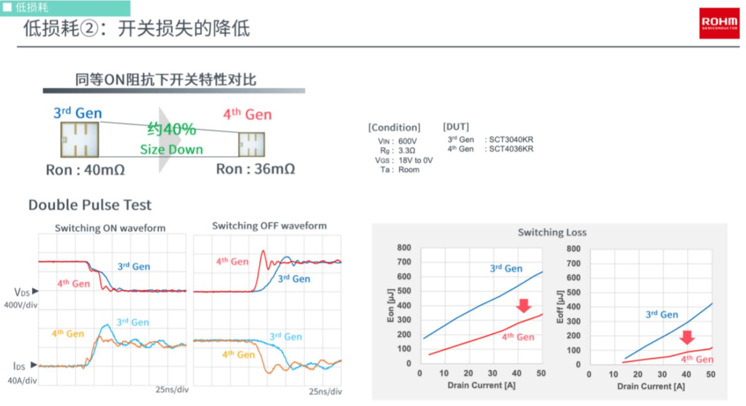 更高速開關(guān)也就減少了在開關(guān)過程中的損耗,同等ON阻抗的話,第四代SiC相比第三代就可以實(shí)現(xiàn)40%的尺寸減少;開關(guān)特性的改善,可大幅度改善開關(guān)損耗。