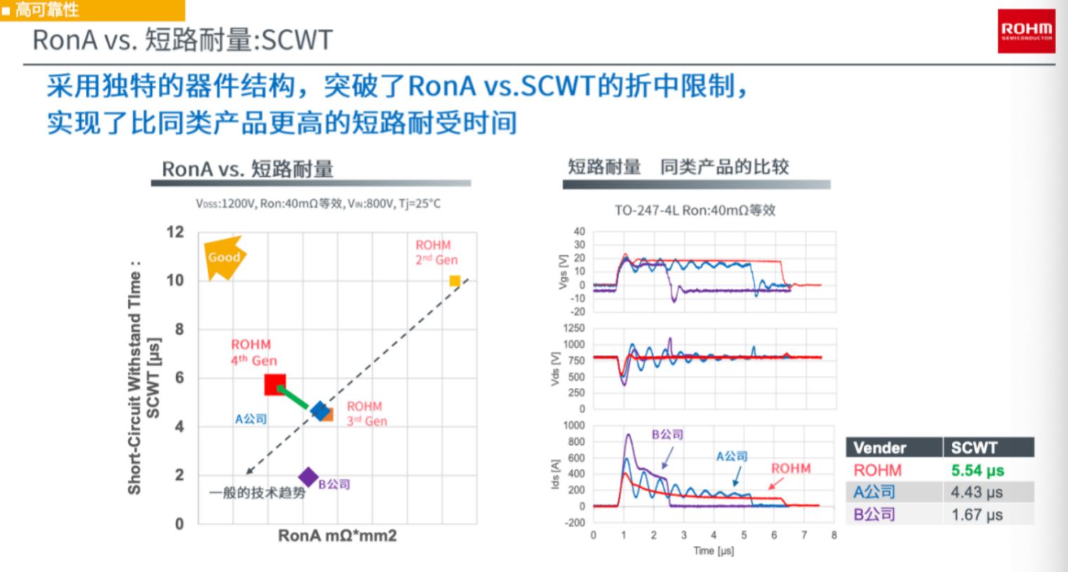 ROHM第4代SiC MOSFET產(chǎn)品的關(guān)鍵特性之一就是高可靠性。通常來說,標(biāo)準(zhǔn)導(dǎo)通阻抗跟短路耐受時(shí)間是互斥的,RonA減小會(huì)導(dǎo)致短路耐受時(shí)間變短。但ROHM通過獨(dú)特的器件結(jié)構(gòu),實(shí)現(xiàn)了更低的飽和電流值,從而在RonA減小的同時(shí),也保證了更長(zhǎng)的短路耐受時(shí)間。