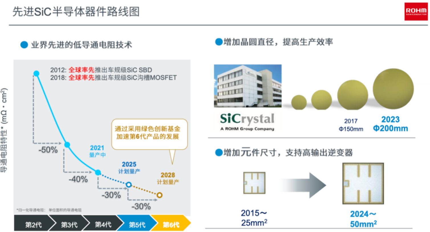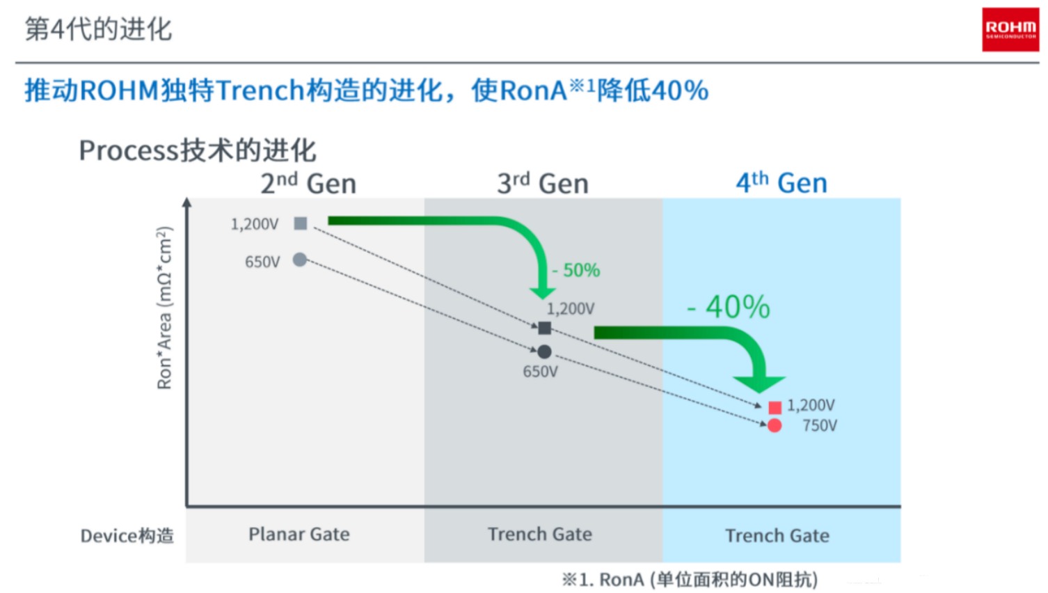 ROHM通過業(yè)內(nèi)先進(jìn)的低導(dǎo)通電阻技術(shù),針對(duì)第四代SiC元件的溝槽設(shè)計(jì)進(jìn)行了優(yōu)化,使得導(dǎo)通電阻(RonA)相比第三代SiC降低了40%。2025年有望實(shí)現(xiàn)第五代SiC,導(dǎo)通電阻會(huì)進(jìn)一步降低30%;2028年計(jì)劃推出第六代SiC,導(dǎo)通電阻繼續(xù)降低30%。