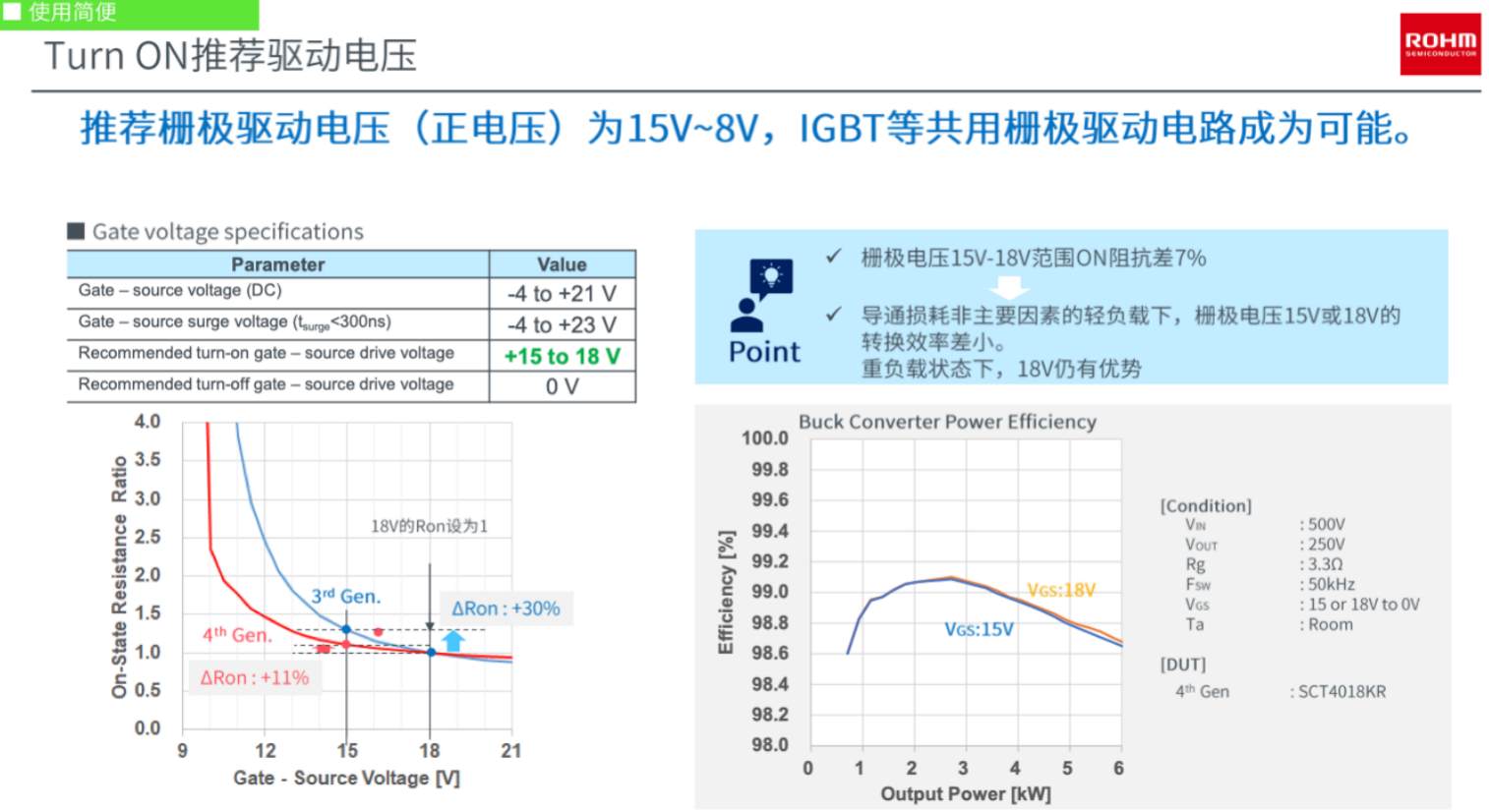 在使用上,ROHM第4代SiC MOSFET提供了三大便利。首先是驅(qū)動(dòng)電壓的降低。15V跟18V兩種驅(qū)動(dòng)電壓的導(dǎo)通阻抗只有11%的差距,因此在15V的情況下就可以滿足一般狀態(tài)的SiC全負(fù)載驅(qū)動(dòng)。也就是說與IGBT等目前廣泛應(yīng)用的柵極驅(qū)動(dòng)電路就可以滿足其驅(qū)動(dòng)要求,從而實(shí)現(xiàn)了客戶驅(qū)動(dòng)電路設(shè)計(jì)的簡(jiǎn)化。