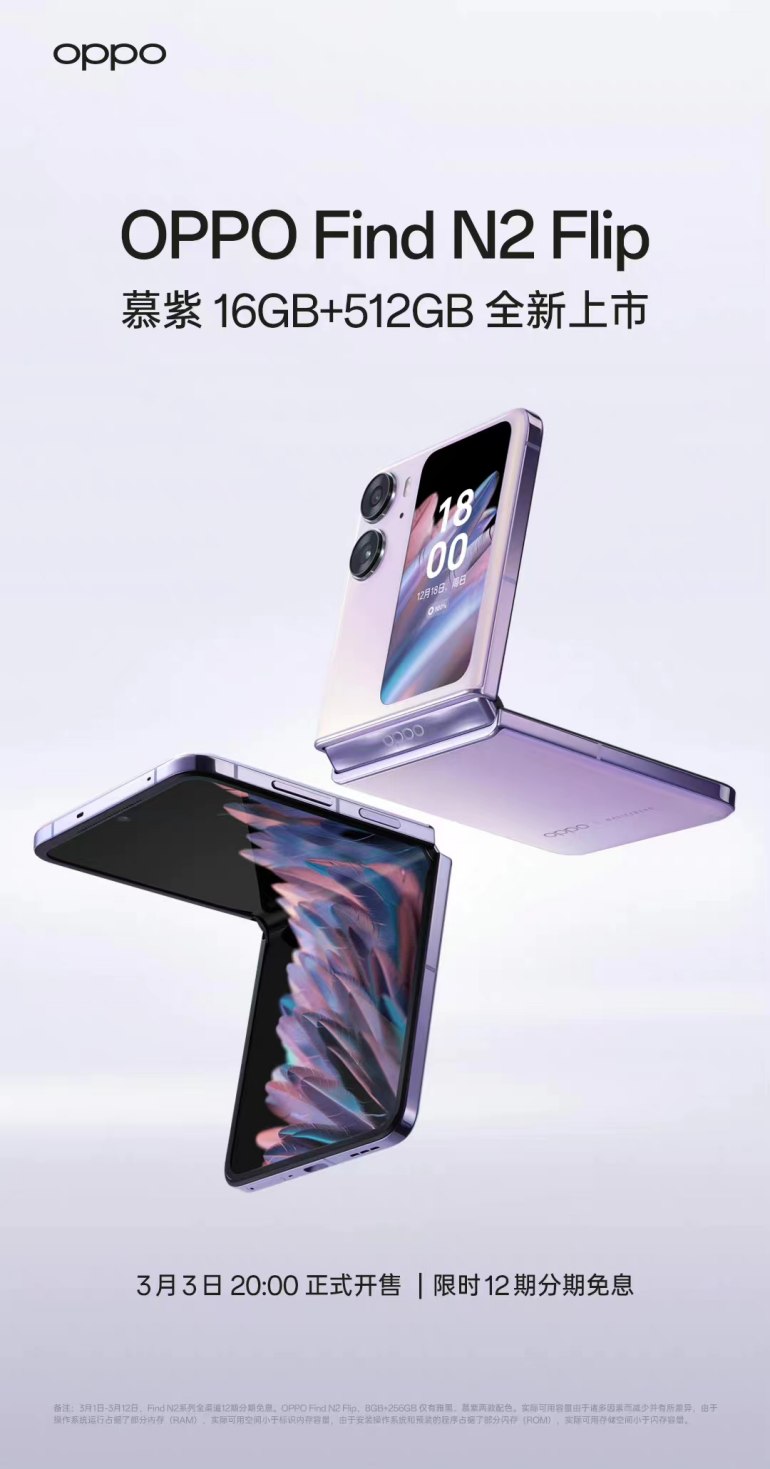 OPPO Find N2 Flip發(fā)布慕紫色16+512GB大內(nèi)存版本,售價6999元