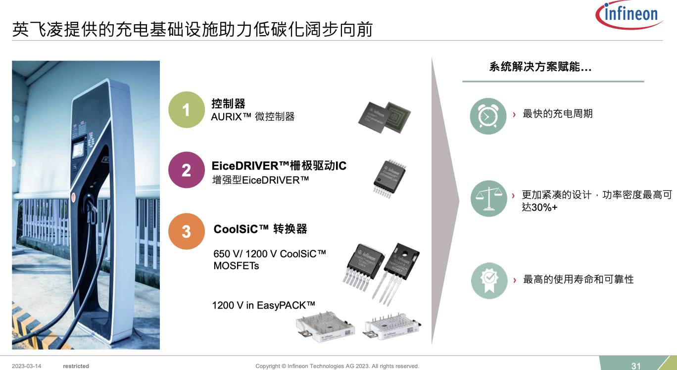 在電動(dòng)車充電基礎(chǔ)設(shè)備方面,英飛凌有AURIX微控制器、EiceDRIVER柵極驅(qū)動(dòng)IC以及CoolSiC MOSFETs以及EasyPACK等。這些產(chǎn)品都幫助減少了充電時(shí)間,可以將功率密度最高提高至30%,而且在可靠性、安全性方面都有大規(guī)模提升。