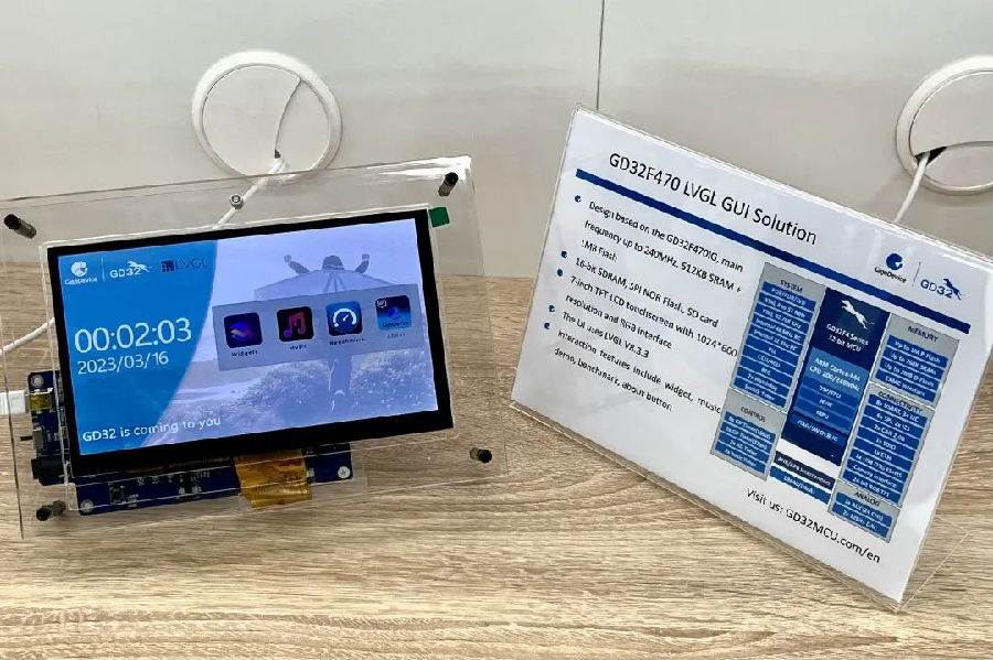 LVGL是一款輕量級(jí)的開(kāi)源免費(fèi)嵌入式GUI設(shè)計(jì)工具,搭載GD32F470可釋放無(wú)限潛能,現(xiàn)場(chǎng)展示的這款demo搭載7寸液晶顯示屏,分辨率為1024*600像素,演示了包含按鈕、標(biāo)簽、滑塊、圖表、鍵盤、儀表、曲線以及表格等多項(xiàng)內(nèi)置組件功能。