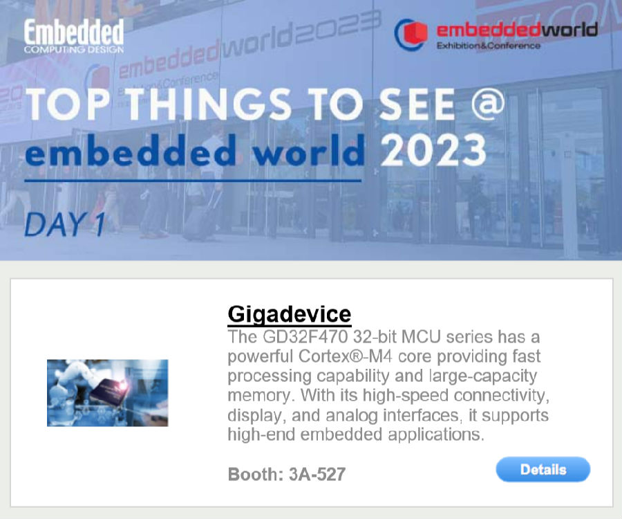 GD32F470系列高性能MCU被評(píng)為本屆大會(huì)“Top Things To See”(最值得一看)的產(chǎn)品,通過(guò)郵件推薦給超2萬(wàn)名來(lái)自全球的嵌入式設(shè)計(jì)工程師。同時(shí),GD32E230系列超值型MCU成功入選了"Best-in-Show"(最佳展覽獎(jiǎng))提名。