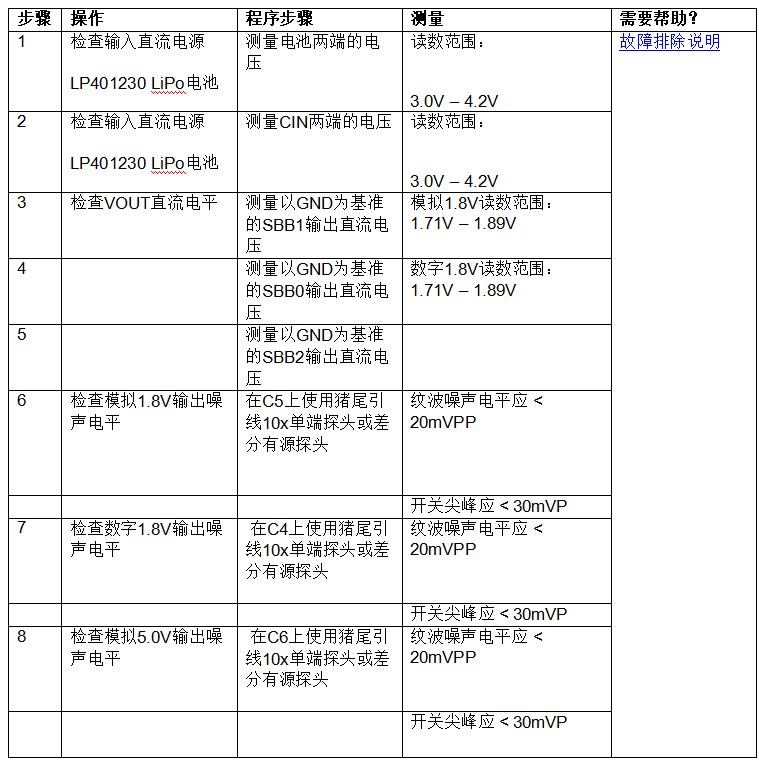 下表可用作檢查清單來驗(yàn)證1.8V/1.8V/5.0V SMPS電路的操作,該電路使用MAX77642器件并連接到一個(gè)生物傳感電路負(fù)載。