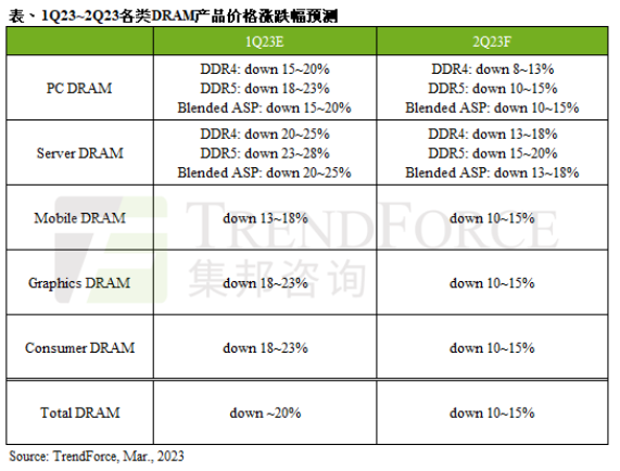 Server DRAM方面,受OEM及云端服務供應商調降服務器需求,進一步導致買方拉貨動能疲弱。然而,消費性市場不明朗,使原廠持續(xù)提升Server DRAM生產比重,因此逐季積累的庫存已成為負擔,雖然原廠已普遍調降產能利用率,但此舉對價格止跌的效果不大,預估第二季Server DRAM均價將環(huán)比下跌13~18%。