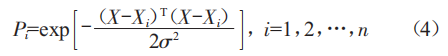 模式層神經(jīng)元個(gè)數(shù)相當(dāng)于訓(xùn)練樣本的數(shù)量,該層計(jì)算測(cè)試樣本與訓(xùn)練樣本中每一個(gè)樣本的高斯函數(shù)取值,其神經(jīng)元傳遞函數(shù)為:
