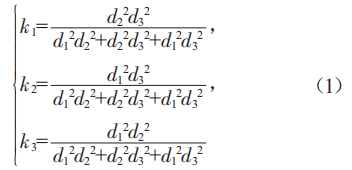 根據(jù)距離平方反比衰減規(guī)律,不同氣象站數(shù)據(jù)權(quán)重的計(jì)算方法為: