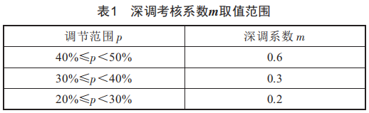 (3)調節(jié)速率考核:機組當月歷次平均調節(jié)速率的平均值。直吹式制粉系統(tǒng)汽包爐的火電機組為每分鐘機組裝機容量的1.5%,每降低0.1%,按1分/(萬kw·h)考核。深度調峰期間,機組平均調節(jié)速率考核分數乘以深調考核系數m。深調考核系數m取值范圍如表1所示。