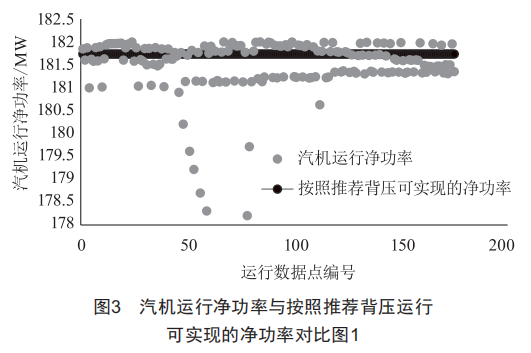 圖3所示為汽機(jī)功率180Mw、環(huán)境溫度在30℃附近時(shí)汽機(jī)運(yùn)行凈功率與按照推薦背壓運(yùn)行可實(shí)現(xiàn)的凈功率對(duì)比,在該工況下,若按照推薦背壓運(yùn)行,平均可多發(fā)電量0.23Mw·h,經(jīng)濟(jì)效益提升約0.13%。