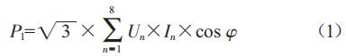 式中(P1為8臺(tái)風(fēng)機(jī)總耗功)kw):Un為第n臺(tái)風(fēng)機(jī)的電壓)V):In為第n臺(tái)風(fēng)機(jī)的電流)A):cosφ為風(fēng)機(jī)相位角余弦值,取0.858。