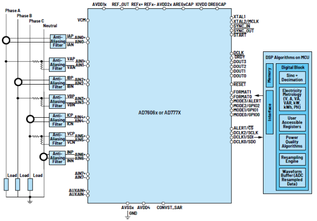 圖4.AD777X和AD7606x系列ADC的電能質(zhì)量3相應(yīng)用系統(tǒng)框圖。
