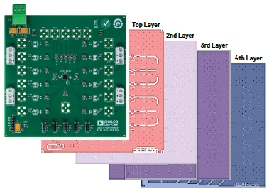 通常,高性能數(shù)據(jù)收集系統(tǒng)應(yīng)有四層或更多層。頂層通常用于數(shù)字/模擬信號(hào),而底層用于輔助信號(hào)。第二層(接地層)充當(dāng)阻抗控制信號(hào)的參考平面,用于減少IR壓降并屏蔽頂層中的數(shù)字信號(hào)。最后,電源平面位于第三層。