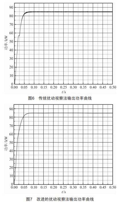 圖6、圖7為傳統(tǒng)擾動(dòng)觀察法與改進(jìn)的擾動(dòng)觀察法的輸出功率曲線圖,二者均在0.05s左右達(dá)到最大功率點(diǎn),但傳統(tǒng)擾動(dòng)觀察法振蕩明顯,改進(jìn)的控制策略在保證追蹤速度的同時(shí)大大提高了系統(tǒng)的穩(wěn)定性,能夠兼顧光伏系統(tǒng)運(yùn)行的速度與穩(wěn)定性。