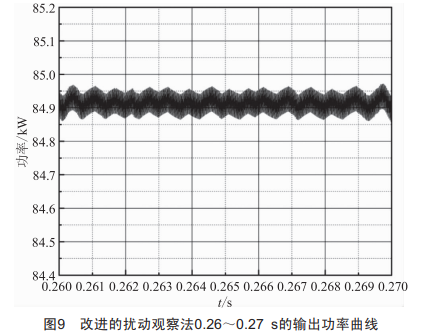 另外,對(duì)傳統(tǒng)的擾動(dòng)觀察法和改進(jìn)的擾動(dòng)觀察法的輸出功率曲線圖截取0.26~0.27s、功率范圍為84.4~85.2kw的部分進(jìn)行對(duì)比,如圖8、圖9所示。從圖8中可以看出,當(dāng)系統(tǒng)達(dá)到最大功率點(diǎn)時(shí),傳統(tǒng)的擾動(dòng)觀察振蕩很大,導(dǎo)致能量損耗嚴(yán)重:如圖9所示,改進(jìn)的擾動(dòng)觀察法顯著減小了振蕩幅度,避免了過(guò)多的能量損失。