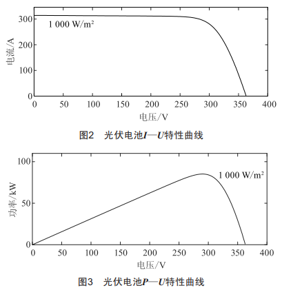 在Matlab軟件中可知在溫度為25℃,光照強(qiáng)度為1000w/m2,Uoc=36.3V,Isc=7.84A,Rs=0.39Ω,根據(jù)以上參數(shù)可以確定光伏電池的輸出電壓與輸出電流的關(guān)系以及輸出功率與輸出電壓的關(guān)系。圖2為光伏電池I一U特性曲線,圖3為光伏電池P一U特性曲線,由圖2、圖3可知光伏電池輸出特性是非線性的,但其在運(yùn)行過(guò)程中有唯一的最大功率點(diǎn),所以,采用最大功率點(diǎn)追蹤方法來(lái)控制光伏電池的最大功率點(diǎn),有利于提高光伏電池的發(fā)電效率。