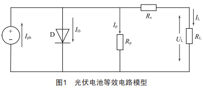 光伏電池是一個(gè)能量轉(zhuǎn)換裝置,它可以將太陽(yáng)能通過(guò)電池內(nèi)部的半導(dǎo)體結(jié)構(gòu)直接轉(zhuǎn)換成可控且有規(guī)律的電能。為了在光伏系統(tǒng)的設(shè)計(jì)中更好地分析光伏電池的特性,以及與光伏控制系統(tǒng)更好地適配,達(dá)到最佳發(fā)電效果,有必要建立光伏電池的數(shù)學(xué)模型,如圖1所示。圖中的二極管D模擬光伏電池PN結(jié)內(nèi)電場(chǎng)的分流作用,分流之后的能量輸出到負(fù)載RL,光伏電池的內(nèi)部損耗由并聯(lián)的電阻RP和串聯(lián)的電阻Rs表示。