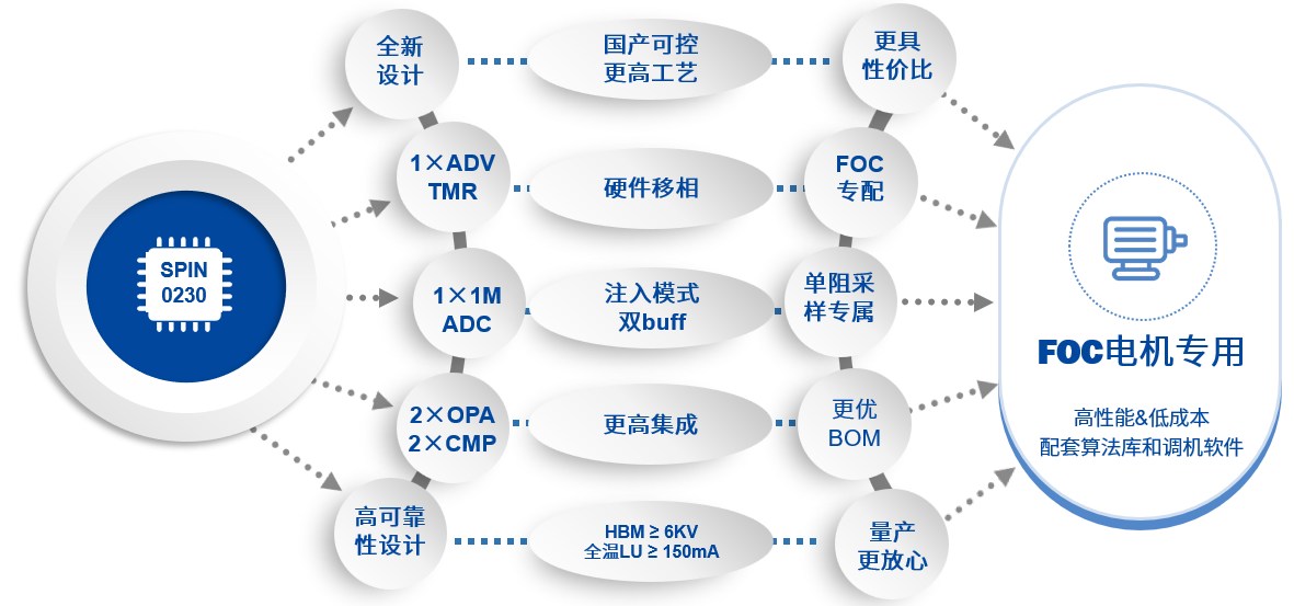 本次發(fā)布的SPIN0230是靈動微電子,第二代電機專用MCU的又一全新平臺,定位于單電機控制,主要針對高速吹風筒,冰箱壓縮機、電動工具、風扇、靜音吊扇、微型水泵、玩具類電調等應用市場。SPIN0230內部集成了具有靈動特色的電機控制功能:高階4路互補PWM、注入功能的高精度ADC、軌到軌運放、輪詢比較器、32位針對霍爾傳感器的捕獲時鐘、以及硬件除法器和DMA等電機算法加速引擎。同時發(fā)布的兩款SOC產品,SPIN030C和SPIN080C內部更是集成了PN預驅、NN預驅、LDO等,使得應用者可以大幅度精簡板級器件。