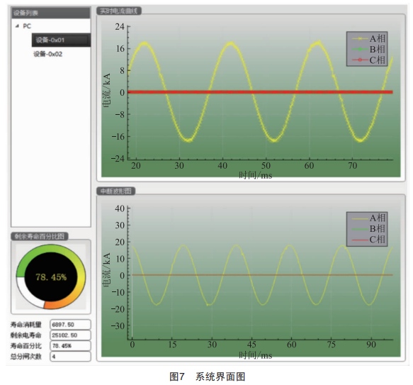 真空斷路器壽命監(jiān)測預(yù)警系統(tǒng)由傳感器、采集器、合并單元及后臺預(yù)警軟件組成,如圖4所示,可實時在線監(jiān)測斷路器開斷及關(guān)合瞬時電流值,結(jié)合預(yù)警系統(tǒng)軟件算法實現(xiàn)對高壓斷路器開斷次數(shù)及電壽命的實時在線監(jiān)測:控制和數(shù)據(jù)處理中心作為后臺軟件,是斷路器電壽命計算及人機交互的中心。軟件實時監(jiān)控真空斷路器,收集監(jiān)測斷路器處大電流,實時計算電壽命的損耗,將計算結(jié)果儲存在數(shù)據(jù)庫,具備多種方式的預(yù)警和查詢功能。