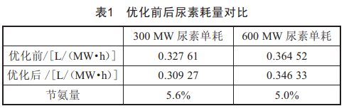優(yōu)化實施后,如表1所示,單位發(fā)電量尿素耗量比優(yōu)化前在300MM和600MM負(fù)荷時分別下降5w6.和5w0.。
