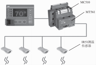 MC510抽屜采用非接觸式的紅外測(cè)溫傳感器IR51,通過(guò)檢測(cè)一次插發(fā)射出的紅外能量,實(shí)現(xiàn)對(duì)抽屜進(jìn)/出線(xiàn)側(cè)一次插的實(shí)時(shí)在線(xiàn)溫度管理。熱點(diǎn)監(jiān)控模塊MT561有兩個(gè)通道,每個(gè)通道最多可以連接6個(gè)紅外測(cè)溫傳感器IR51。MT561通過(guò)I/0BUS直接連接至MC510,MC510將采集的數(shù)據(jù)實(shí)時(shí)傳送至智慧型馬達(dá)監(jiān)控系統(tǒng)IMCS及DCS系統(tǒng),后臺(tái)系統(tǒng)可對(duì)測(cè)得的溫度進(jìn)行判斷,當(dāng)溫度超過(guò)設(shè)定的告警值或脫扣值時(shí),可進(jìn)行報(bào)警或