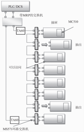 MC510環(huán)型拓?fù)淠軌蚝芎玫乇WC單個(gè)抽屜的抽出維護(hù)不影響其他抽屜的通信,但當(dāng)兩個(gè)及以上抽屜抽出維護(hù)時(shí),會(huì)導(dǎo)致中間正常運(yùn)行的抽屜的通信中斷。為解決這一問(wèn)題,在低壓開(kāi)關(guān)柜的電纜室內(nèi)安裝有以太網(wǎng)環(huán)路開(kāi)關(guān)MS571,保證MC510的抽屜抽出時(shí)整個(gè)系統(tǒng)的以太網(wǎng)通信還能正常工作。其工作原理如圖2所示,正常情況下,抽屜內(nèi)電機(jī)管理單元MC510通過(guò)MS571上的BUS接口同其他MC510抽屜通信:當(dāng)抽屜抽出后,MS571可以自動(dòng)旁路該回路,使得環(huán)網(wǎng)自動(dòng)恢復(fù)連接,系統(tǒng)以太網(wǎng)通信不受影響。