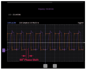 開啟固定5 V電源,并將9 V電池連接到電路。將AWG1輸出連接到FREF,如圖4所示。將AWG1配置為方波,其幅度為5 V峰峰值,偏置為2.5 V(0 V至5 V擺幅);將初始頻率設置為第1步中測得的值(即VIN設置為2.5 V時,應在250 kHz左右)。將示波器通道輸入CH1+連接到FREF輸入,并將示波器通道CH2+連接到VSQR輸出,如圖6所示。還應該將CH1-和CH2-輸入接地。將示波器設置為在通道1(FREF信號)的上升沿觸發(fā)。