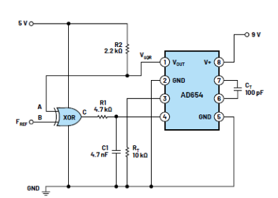 在FREF的頻率設為對應于AD654引腳4上2.5 V控制電壓的情況下,VSQR處看到的輸出頻率應鎖定輸入基準頻率FREF。在示波器屏幕上,您應該看到兩個方波是穩(wěn)定的(即彼此鎖定),并且VSQR相對于FREF偏移約90°。請記住,當XOR鑒相器的兩個輸入相差90°時,其濾波輸出將處于其輸出范圍的一半或約2.5 V。