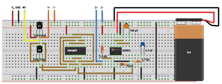 接下來,在試驗板上添加來自上一個實驗的異或門鑒相器電路,如圖5所示。構建異或門后,將其連接到V轉F電路,如圖6所示,以構成完整的PLL。在給電路添加任何東西之前,務必關閉5 V電源并斷開9 V電池。