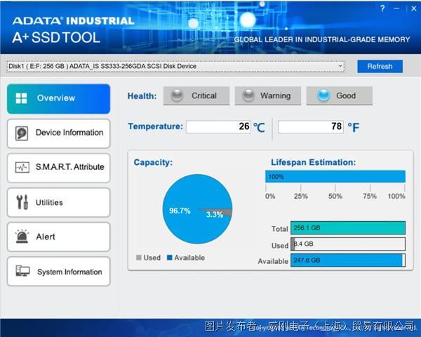 威剛獨(dú)家智慧智慧S.M.A.R.T.管理軟件,可以直接在「S.M.A.R.T.監(jiān)控」和「產(chǎn)品壽命信息」等功能頁面查看狀況進(jìn)行比對分析。