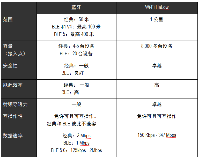 下表列出了Wi-Fi HaLow與藍(lán)牙的比較,顯示了兩種協(xié)議的各自特點(diǎn)。