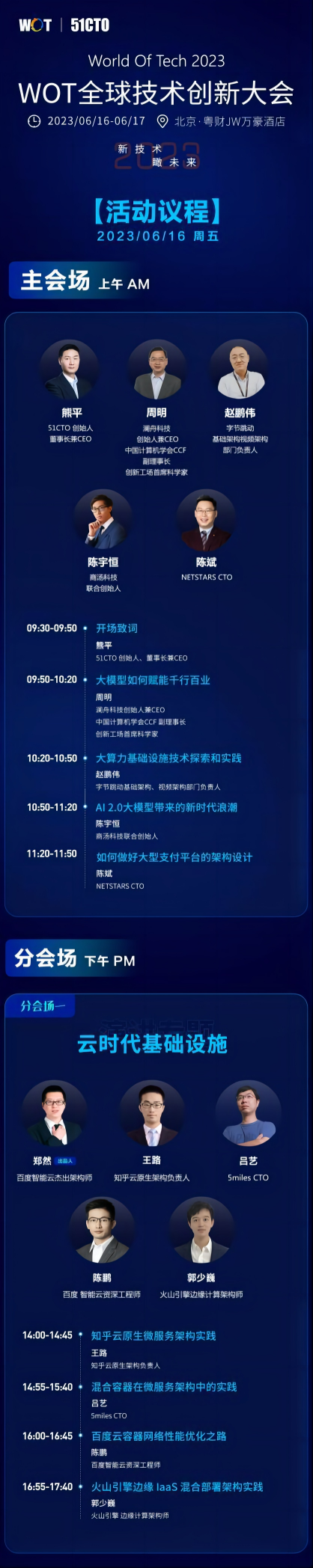 秉承這樣的原則,WOT攜手瀾舟科技創(chuàng)始人兼CEO、中國計(jì)算機(jī)學(xué)會(huì)CCF副理事長、創(chuàng)新工場(chǎng)首席科學(xué)家周明,火山引擎總裁譚待,商湯科技聯(lián)合創(chuàng)始人陳宇恒等多位聯(lián)席主席,以及來自架構(gòu)、云計(jì)算、數(shù)據(jù)智能、AIGC、研發(fā)效能、大前端等領(lǐng)域,具備多年一線實(shí)踐經(jīng)驗(yàn)的11位出品人,共同為大會(huì)內(nèi)容質(zhì)量保駕護(hù)航。