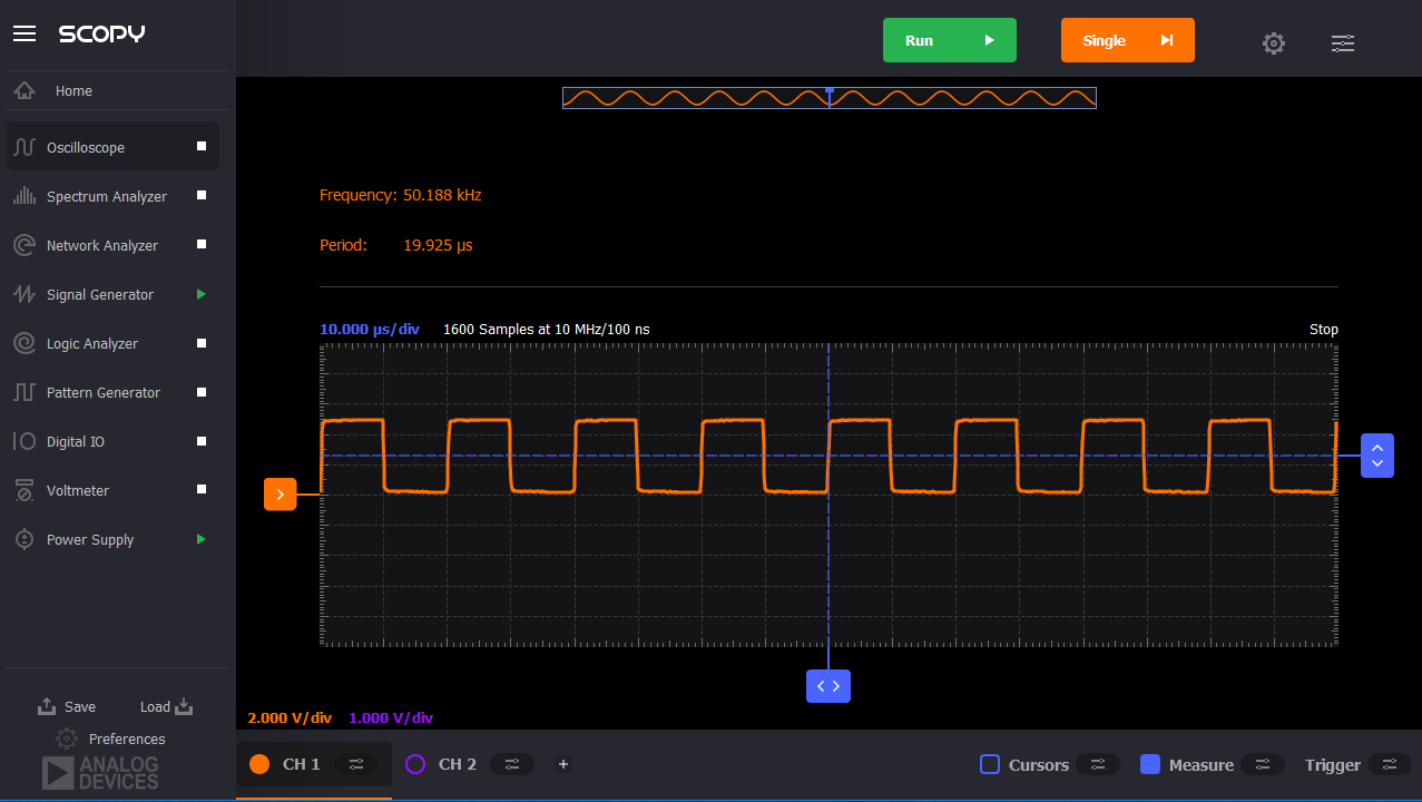 示波器:200 ms時基,通道1設(shè)置為400 mV/刻度。下降沿觸發(fā)器,200 mV(將在積分器重置間隔開始時觸發(fā)M2K)。
