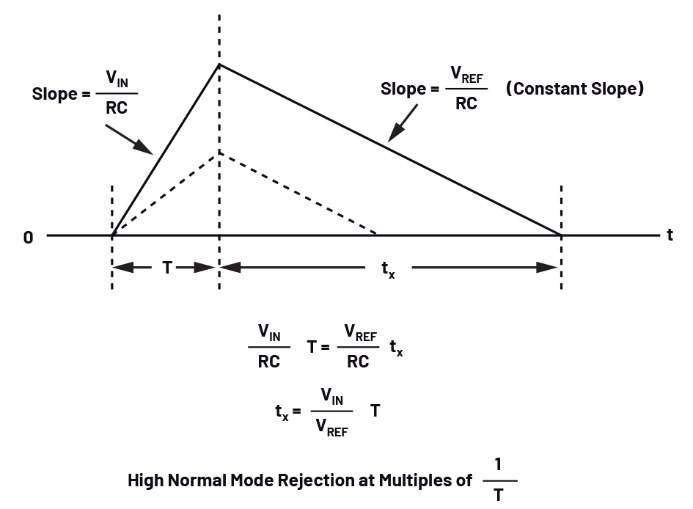 轉(zhuǎn)換器的工作原理如下:在固定時間內(nèi)對積分器施加未知輸入電壓(稱為上坡(runup)),然后對積分器施加與輸入極性相反的已知基準(zhǔn)電壓(稱為下坡(rundown))。因此,輸入電壓可以根據(jù)基準(zhǔn)電壓和下坡-上坡時間比計算得到: