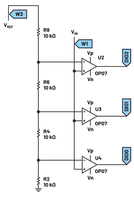 在無焊試驗板上構(gòu)建圖7所示的電路。這是一個用于具有編碼輸出的2位Flash ADC的電路。