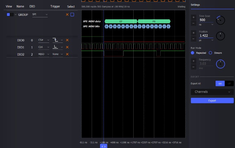 在邏輯分析儀中,將DIO0、DIO1和DIO2配置為一個組通道。將該組通道設(shè)置為SPI,各通道設(shè)置為對應(yīng)的SPI信號——DIO0為CS#,DIO1為CLK,DIO2為MISO。當(dāng)CS#下降沿啟動數(shù)據(jù)傳輸時,應(yīng)將DIO0觸發(fā)器設(shè)置為下降沿。將DIO1觸發(fā)器設(shè)置為低電平,并從觸發(fā)器設(shè)置中將“觸發(fā)器邏輯”設(shè)置為AND。DIO2是ADC的輸出信號,不需要觸發(fā)器設(shè)置。使能邏輯分析儀,它應(yīng)在等待觸發(fā)信號。