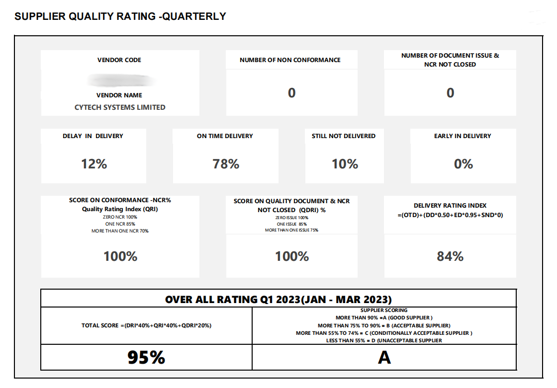 中國,深圳——近日,業(yè)內(nèi)領(lǐng)先的電子元器件獨立分銷商,深圳創(chuàng)實技術(shù)有限公司(簡稱“創(chuàng)實技術(shù)”或“Cytech Systems”)在全球一家扎根工業(yè)級以上高精尖制造領(lǐng)域OEM客戶的2023年第一季度供應(yīng)商評比中取得了95的高分,被評為A級供應(yīng)商。特別是在貨源質(zhì)量維度的細分項評比中——這項該客戶最為看重的要素,創(chuàng)實技術(shù)更是拿到了100分的滿分成績。