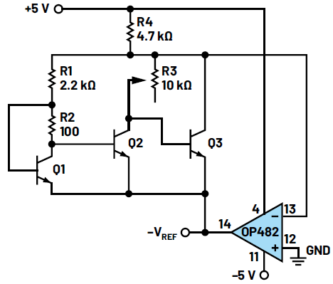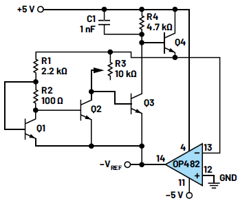 打開正負(fù)電源。觀察-VREF處(運(yùn)算放大器的引腳14)的電壓和帶隙并聯(lián)穩(wěn)壓器(Q3的集電極和發(fā)射極)上的電壓。可以調(diào)整電位計(jì)R3以產(chǎn)生-1.25 V基準(zhǔn)電壓。