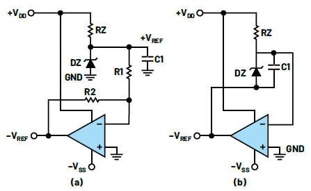 考察圖1a可以發(fā)現(xiàn),由于反相運(yùn)算放大器配置的虛地特性,齊納電壓+VREF作用于電阻R1上。如果R2正好等于R1,則同一電壓VREF也會(huì)出現(xiàn)在R2上,但相對(duì)于地的符號(hào)相反。R2兩端的電壓與齊納二極管兩端的電壓相同,因此我們實(shí)際上可以用反饋環(huán)路中的二極管代替R2,如圖1b所示,并且仍然在-VREF處產(chǎn)生相同的電壓。RZ只是設(shè)置齊納二極管中的偏置電流水平,與圖1a中的RZ非常相似。在圖1b中,IZ等于VDD/RZ,而在圖1a中,IZ等于(VDD – +VREF)/RZ。為使兩種情況下的設(shè)計(jì)具有相同的IZ,我們只需更改RZ的值。電容C1解耦接地端和輸出端之間的基準(zhǔn)二極管。此外,具有低電感的0.1μF電源解耦電容(圖1中未顯示)通常連接到+VDD和-VSS,非??拷\(yùn)算放大器。