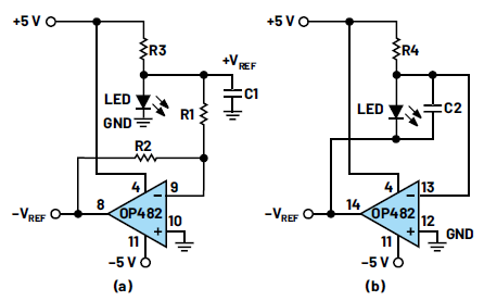 圖2.生成-VREF的兩種可能方法:(a)使用兩個(gè)匹配電阻(R1和R2)的標(biāo)準(zhǔn)方法,以及(b)不使用電阻的更高精度方法——使用LED代替圖1a和1b中的齊納二極管