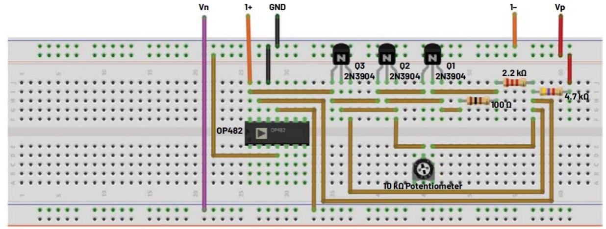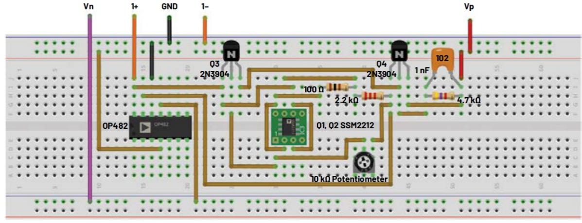 修改第1步中的試驗(yàn)板設(shè)置,如圖5所示。對(duì)試驗(yàn)板進(jìn)行任何修改之前,確保關(guān)閉電源。用并聯(lián)穩(wěn)壓器替換LED。電阻R1和R2以及晶體管Q1連接為零增益放大器。如同在穩(wěn)定電流源中一樣添加電阻R3和晶體管Q2。如果使用SSM2212匹配的NPN對(duì),應(yīng)將其用于器件Q1和Q2。添加Q3作為共發(fā)射極,其基極連接到Q2的集電極,集電極連接到R1、R3和R4的組合節(jié)點(diǎn)。