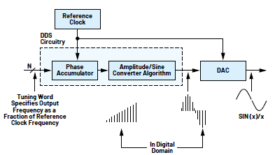 根據(jù)應(yīng)用的不同,DDS架構(gòu)作為頻率合成器可能比PLL提供了一種更好的替代方案。。圖2顯示了一個(gè)典型的基于DDS的信號(hào)發(fā)生器。調(diào)諧字應(yīng)用于相位累加器,由后者確定輸出斜坡的斜率。累加器的高位經(jīng)過(guò)幅度正弦轉(zhuǎn)換器,最終到達(dá)DAC。與PLL相比,DDS的架構(gòu)具有明顯的優(yōu)勢(shì)。例如,DDS數(shù)字相位累加器可實(shí)現(xiàn)比基于PLL的頻率合成器更精細(xì)的輸出頻率調(diào)諧分辨率。