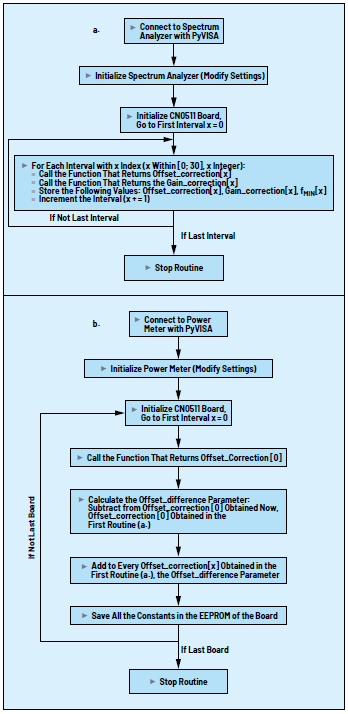 圖12.偽代碼流程圖:(a) 只運(yùn)行一次的第一個(gè)校準(zhǔn)例程;(b) 在每個(gè)CN0511板上運(yùn)行的第二個(gè)校準(zhǔn)例程。