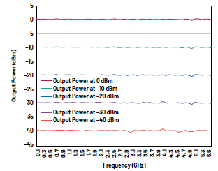 圖13顯示了CN0511在幾種不同輸出功率水平下的寬帶補(bǔ)償頻帶平坦度。對(duì)于設(shè)置在0 dBm和-40 dBm之間的任何輸出功率,從DC到5.5 GHz的整個(gè)頻帶內(nèi)的精度為±0.5 dBm。