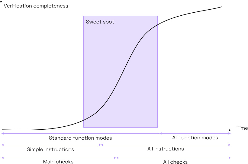 應(yīng)用這種方法可以提高驗證團隊的工作效率。在項目的關(guān)鍵階段提高效率。雖然在開始時構(gòu)建正確的設(shè)置需要付出努力,但隨著我們添加新的指令類別和新的檢查器,進度就會加快。這個“最佳點”是我們發(fā)現(xiàn)大多數(shù)問題的地方,隨著放寬約束以允許該工具探索更深奧的操作模式,速度就開始放緩。