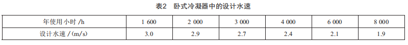 某型遠(yuǎn)洋船舶目前配備有540kw冷水機(jī)組4臺(tái)、280kw冷水機(jī)組2臺(tái),按照實(shí)際使用情況,一般同時(shí)使用2臺(tái)540kw冷水機(jī)組、1臺(tái)280kw冷水機(jī)組,初步計(jì)算,遠(yuǎn)洋船舶單臺(tái)機(jī)組的年實(shí)際使用時(shí)間在4000h以上。參照《制冷原理與設(shè)備》,臥式冷凝器設(shè)計(jì)參數(shù)選擇如表2所示。加裝聚乙烯護(hù)套后,只要冷凝器銅管內(nèi)的水流速小于2.4m/S,即可滿足要求。